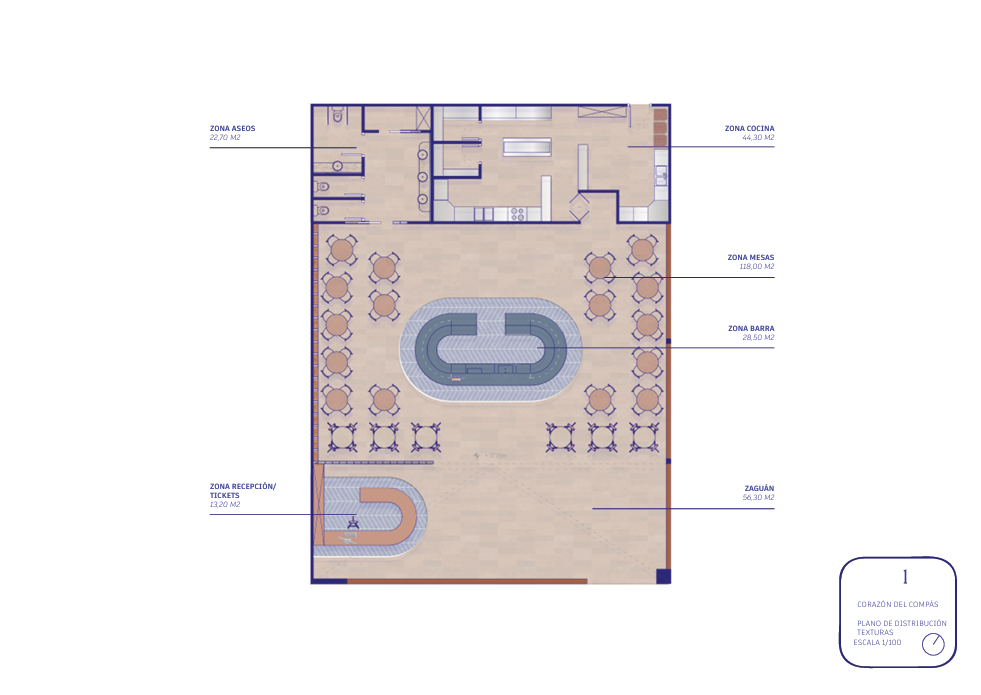En la zona de la terraza, predominan mesas altas con vistas a la laguna, creando un espacio de disfrute y contemplación. Las barandillas de vidrio permiten la visión directa del agua y del paisaje.