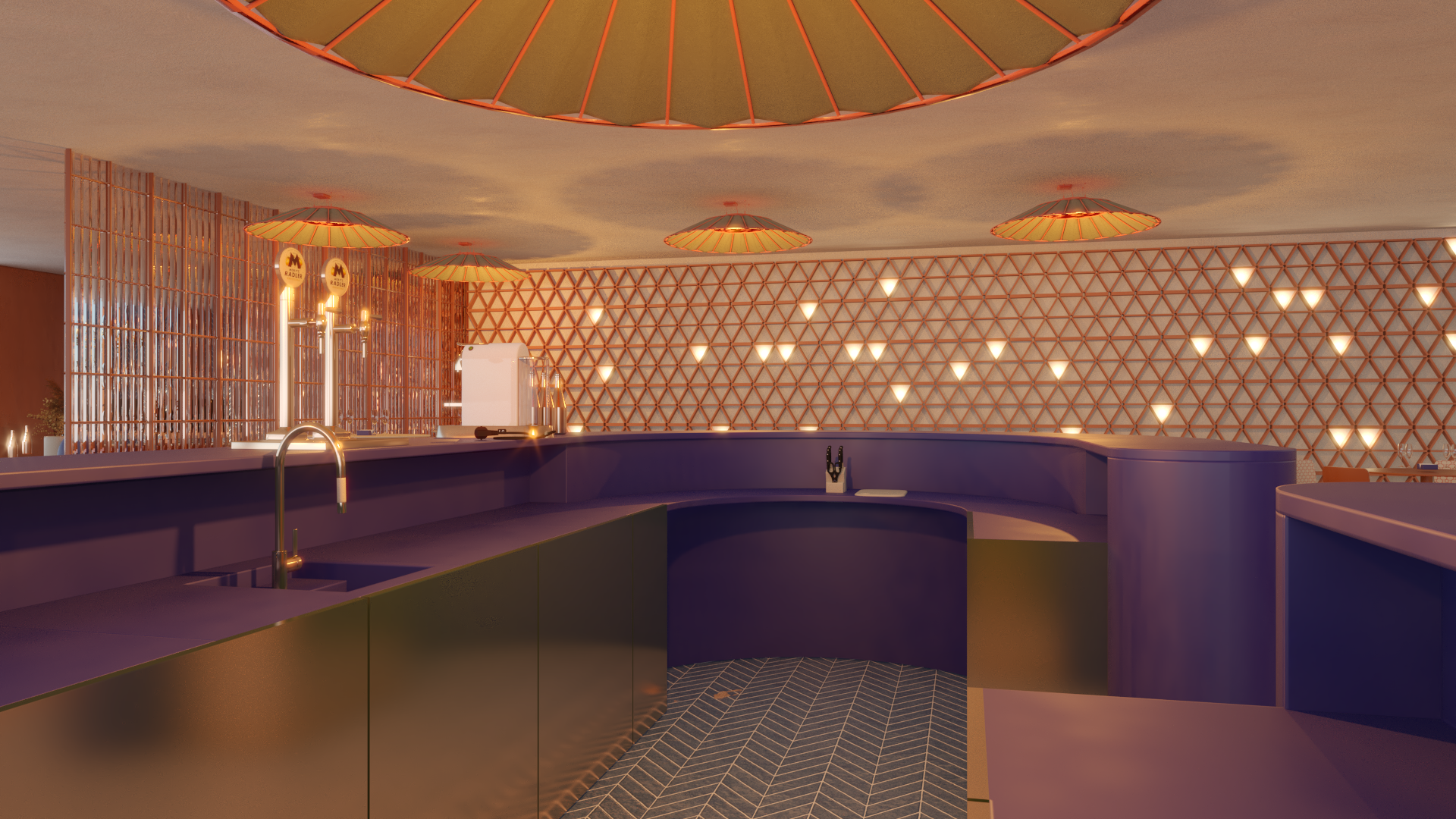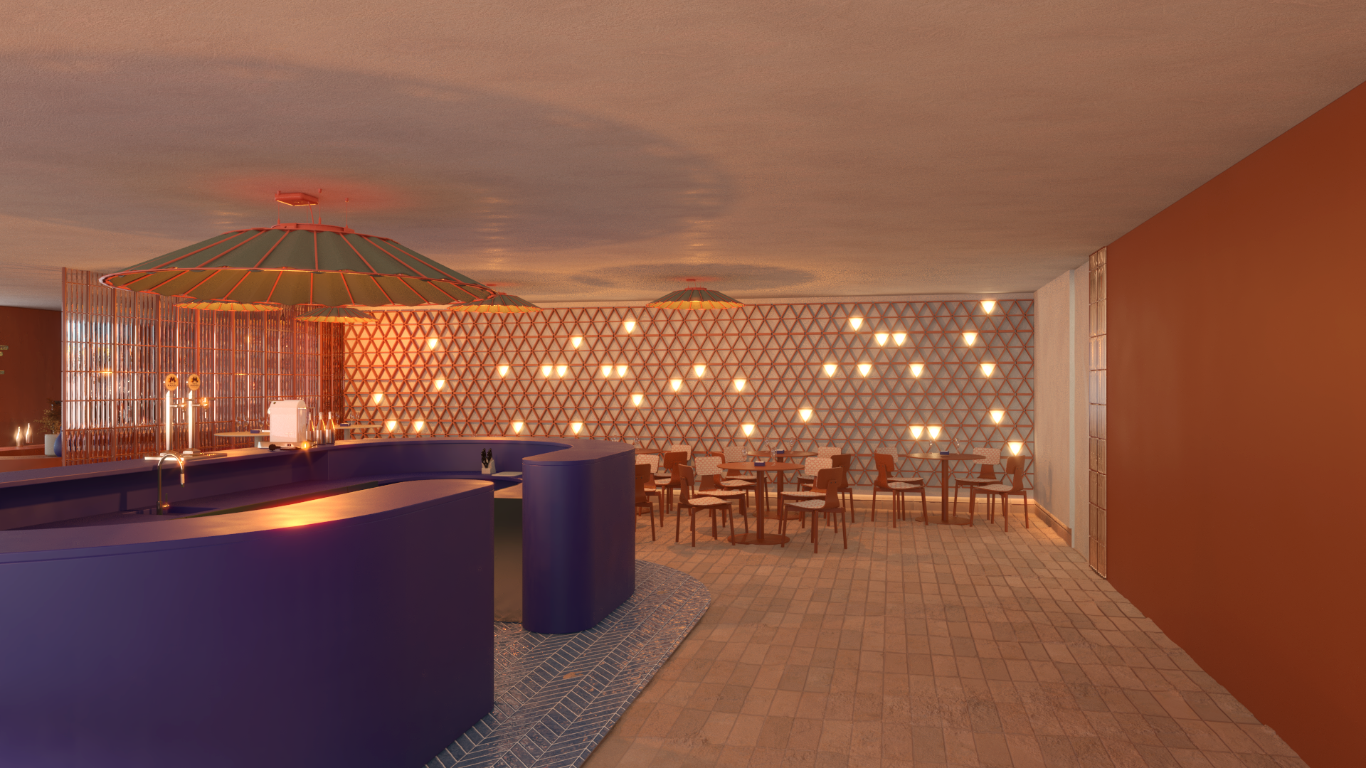 Un ventanal de gran tamaño proporciona luz natural abundante al interior, donde se ubica el bar superior, integrando el espacio interior con la terraza y reforzando la conexión visual con la laguna y los jardines.